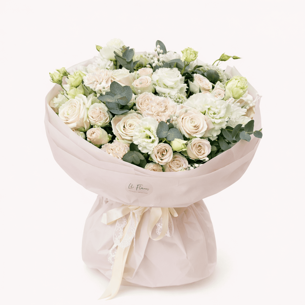 Acest buchet elegant de trandafiri crem și roz pastel, completat cu lisianthus fin, garoafe delicate și frunze de eucalipt, este alegerea perfectă pentru un cadou rafinat și memorabil. Aranjamentul este realizat din flori premium atent selecționate, oferind un aspect sofisticat și armonios, potrivit pentru orice ocazie specială.