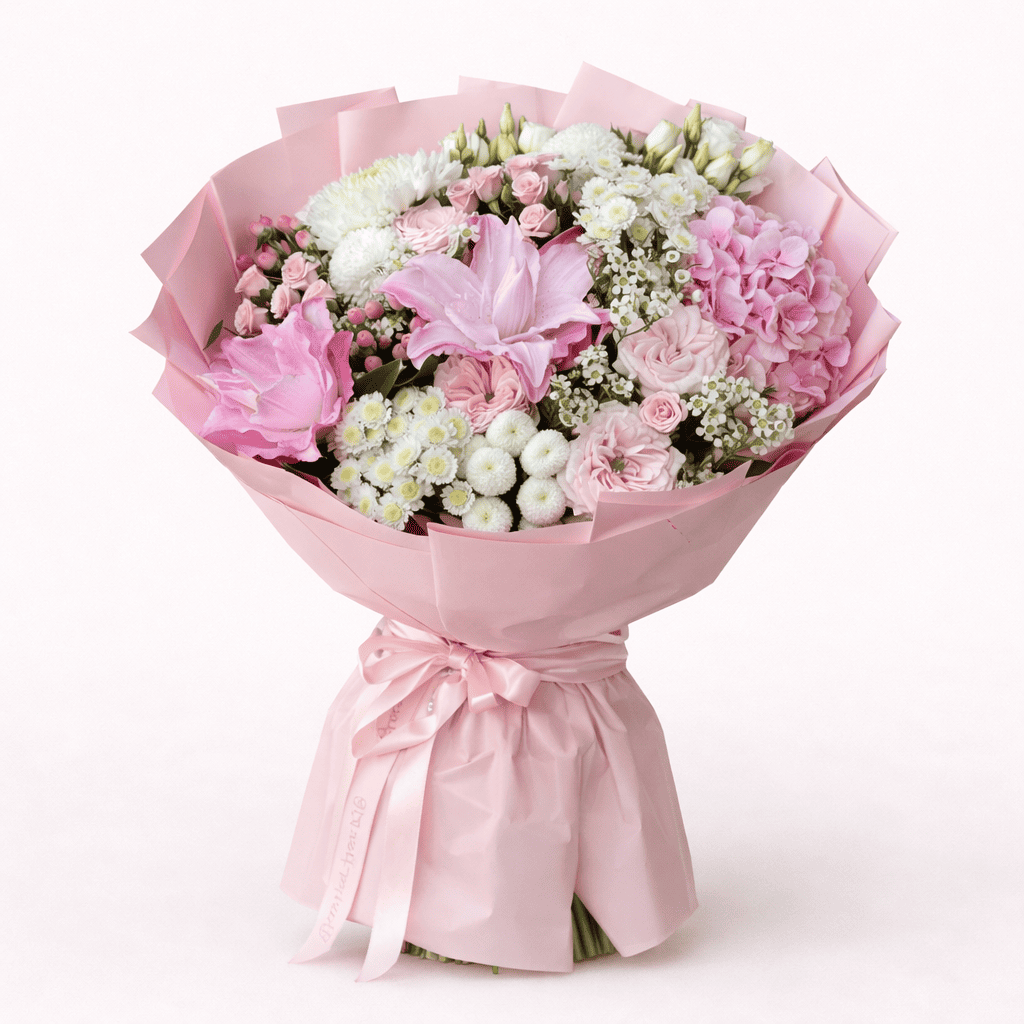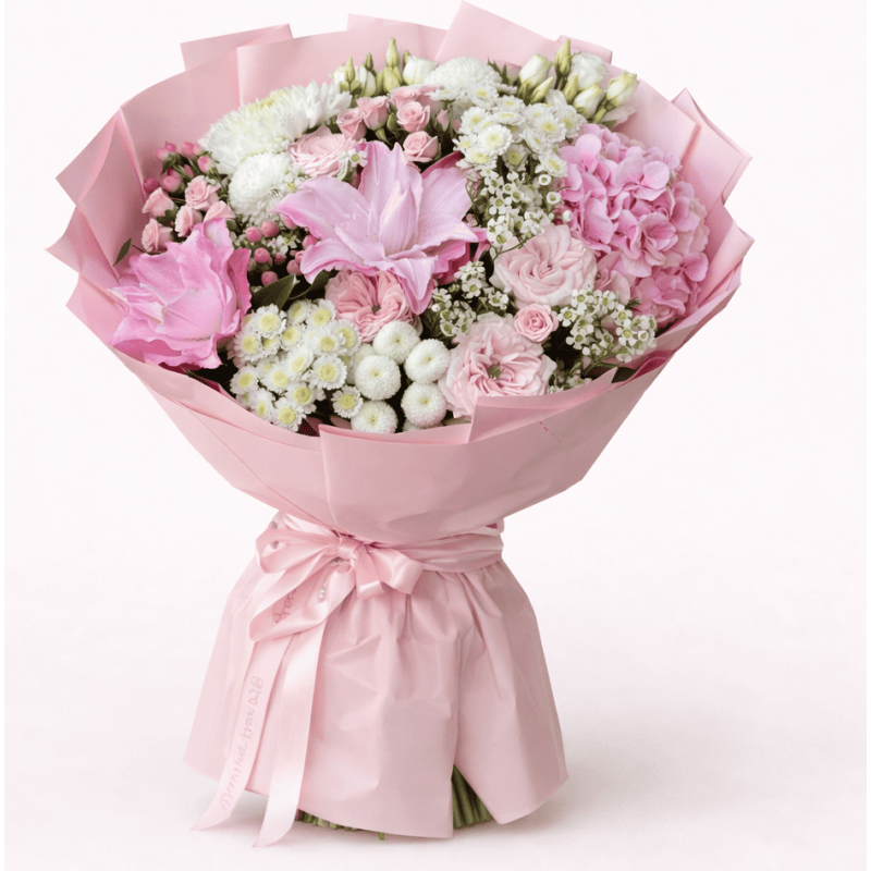 Buchetul „Pink Elegance Deluxe” este o compoziție florală premium, realizată din crini roz, hortensie delicată, trandafiri roz, mini-trandafiri, crizanteme albe și flori decorative atent alese. Aranjamentul este ambalat elegant în hârtie roz pastel și legat cu panglică satinată.