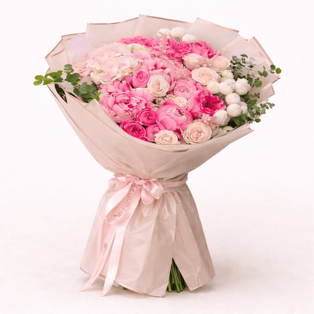 Buchetul Royal Pink Luxury este o compoziție florală premium realizată din trandafiri roz intens, trandafiri crem, hortensie roz, bujori și elemente decorative elegante.