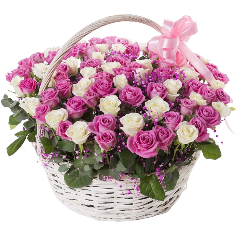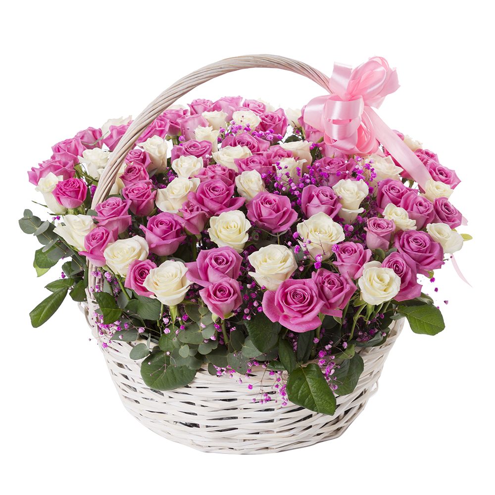 Бело-красные розы — Корзина — 1 шт. Лента атласная — 1 шт.