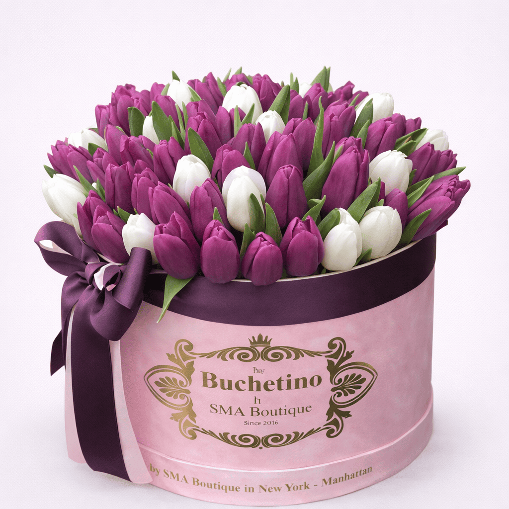 Премиальная цветочная композиция из 35 свежих тюльпанов белого и фиолетового оттенков в элегантной круглой коробке. Гармоничное сочетание чистоты и глубины цвета делает этот букет идеальным подарком на 8 Марта, 14 Февраля, годовщины и романтические сюрпризы.